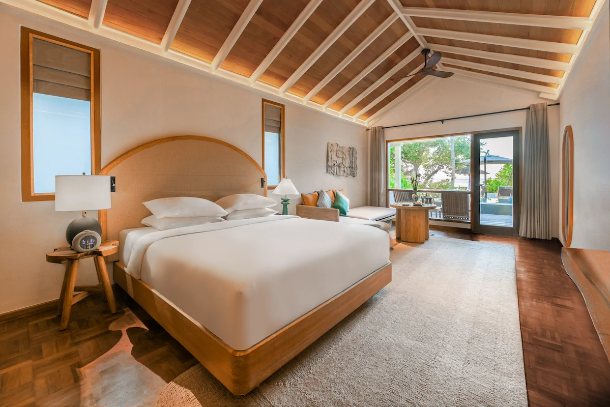 Die Sunset Beach Pool Villa bietet extra viel Platz, ideal für zwei Erwachsene (oder drei Gäste mit Sofa-Bett). Ein luxuriöses King-Size-Bett, ein separater Wohnbereich mit Blick auf privaten Plunge Pool, der zum Strand und Meer führt, eröffnet entspannte Momente.